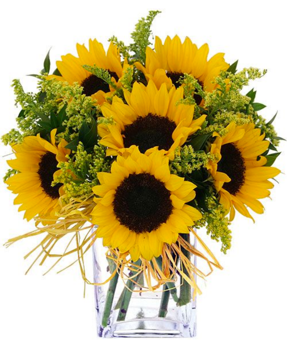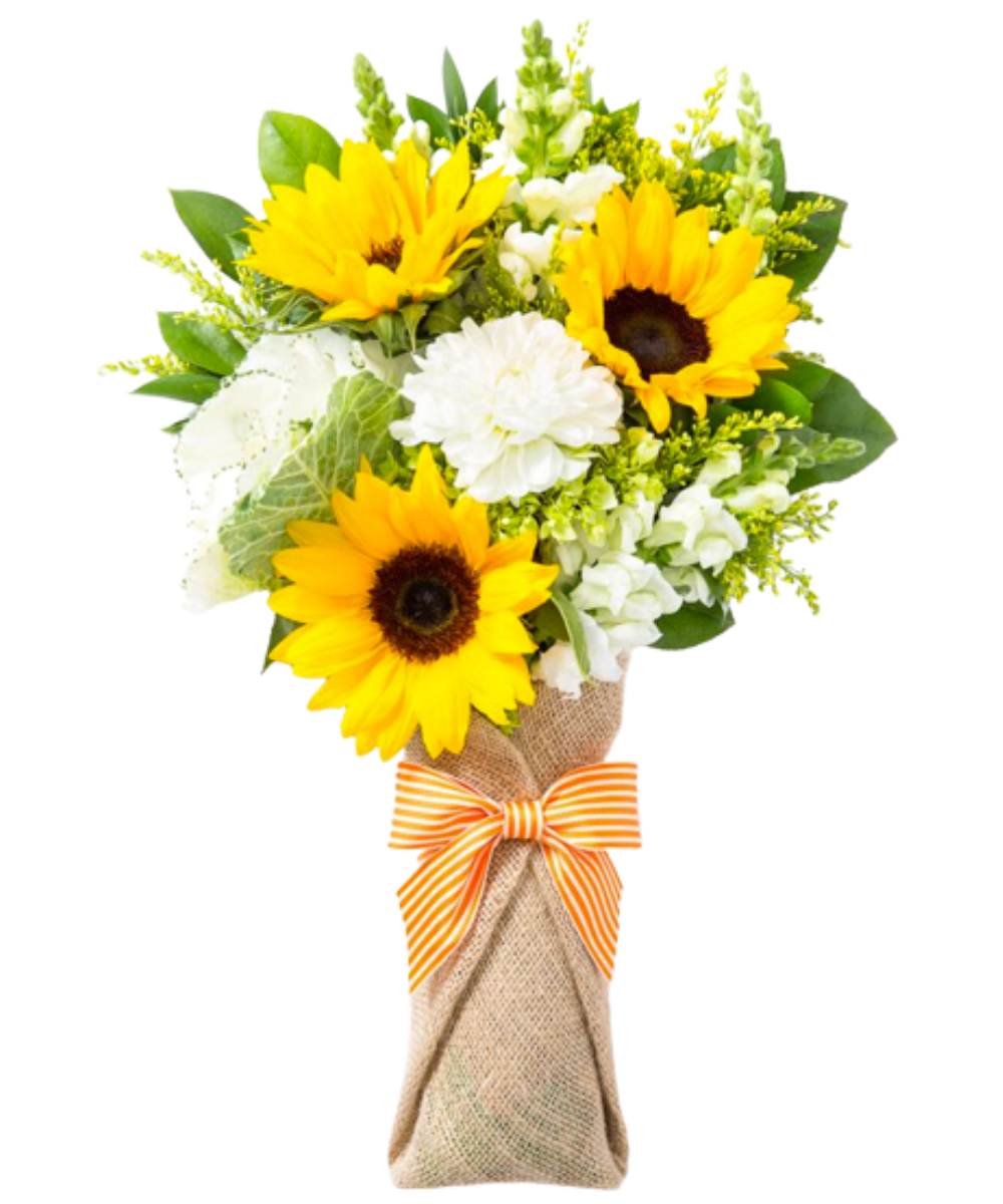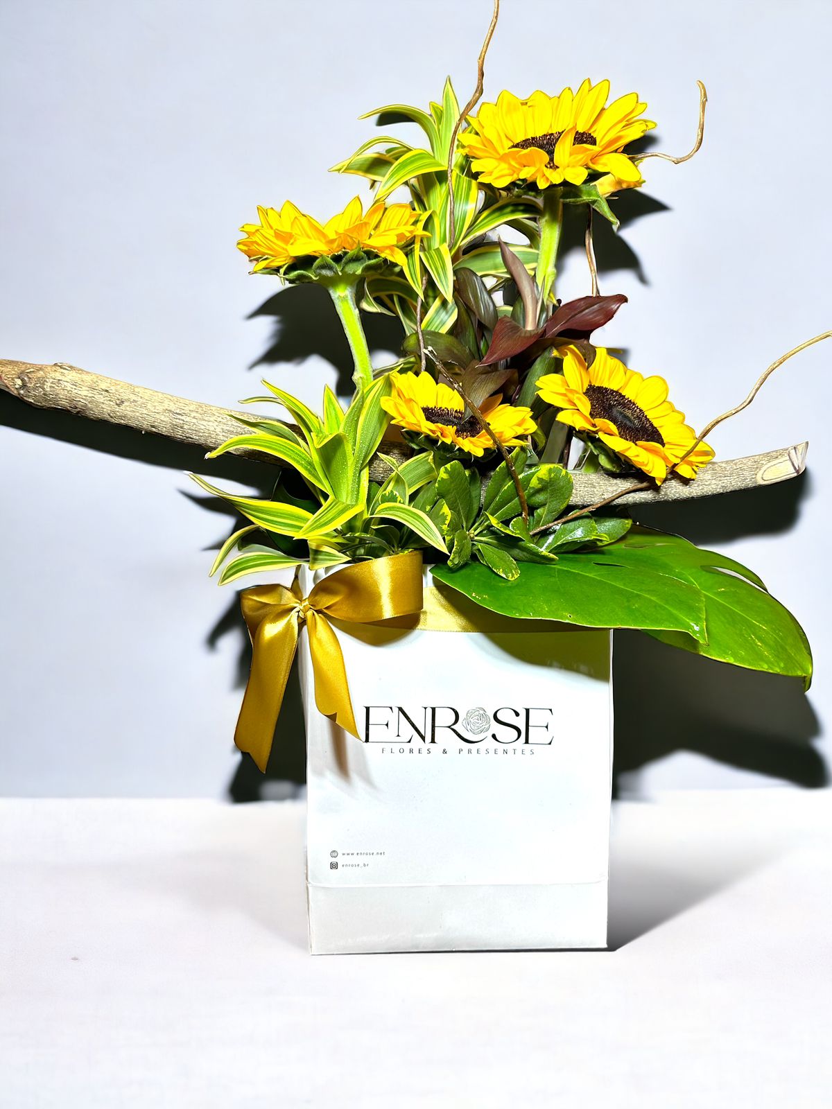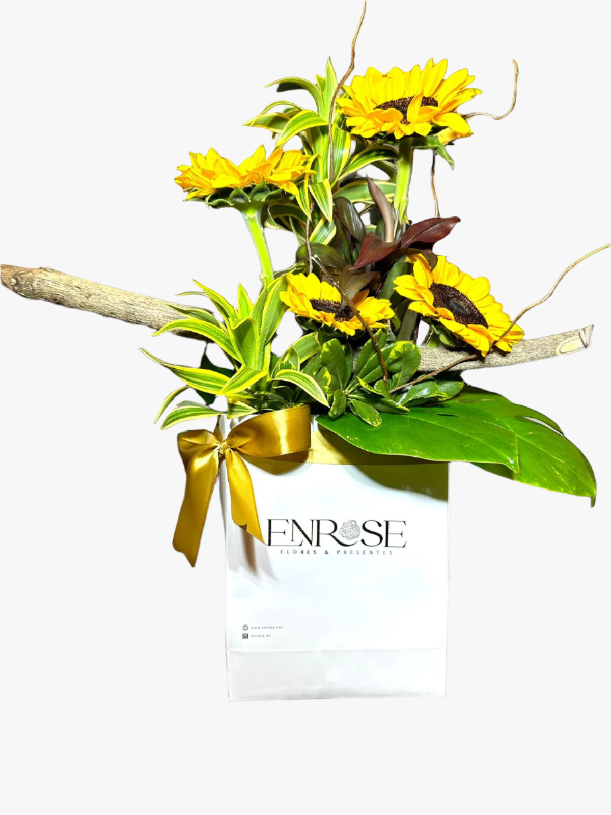 Arranjo de Girassóis com Folhagens Tropicais – Brilho e Alegria